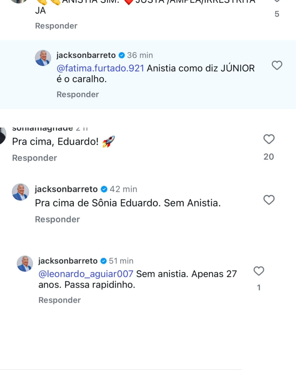 Em outro comentário, Jackson Barreto beira a misoginia: “Pra cima de Sônia, Eduardo. Sem anistia”. Esse é apenas um dos exemplos; há outros na mesma linha.