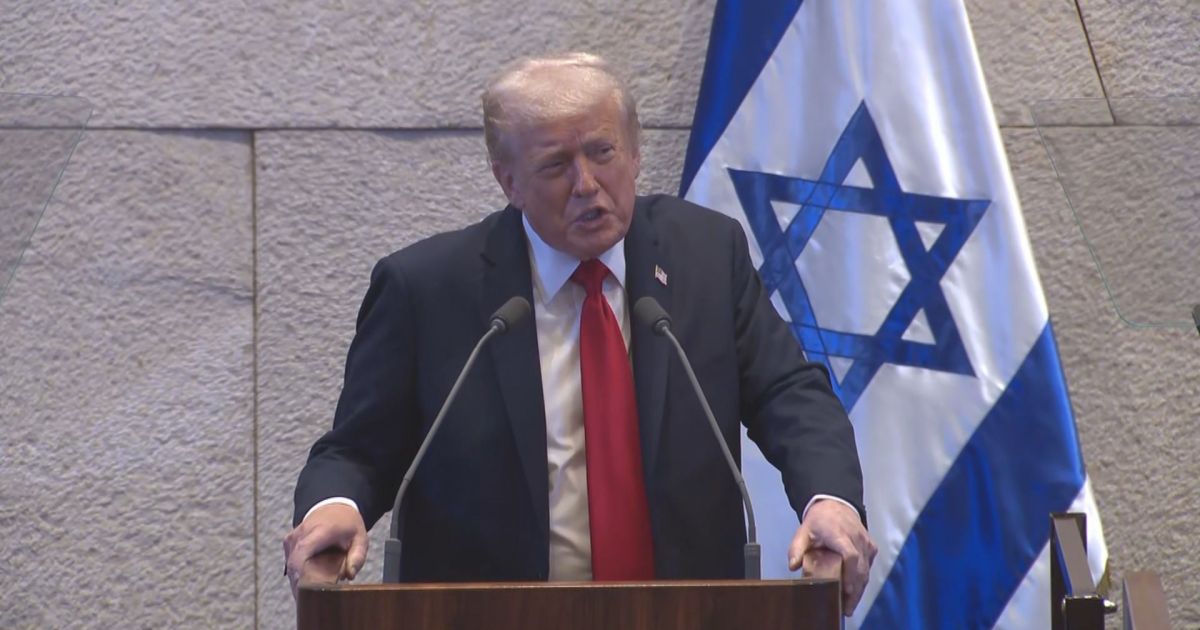O presidente Donald Trump foi interrompido enquanto discursava no Parlamento de Israel nesta segunda-feira (13).