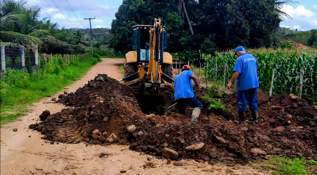 Tubulações fazem a captação da água da barragem do perímetro para distribuição aos ramais. Em 2025, uma série de outros serviços já foram realizados para reparo, manutenção e conservação da rede de água do Jacarecica II, que serve a 338 lotes e atende a quase 600 famílias de agricultores.