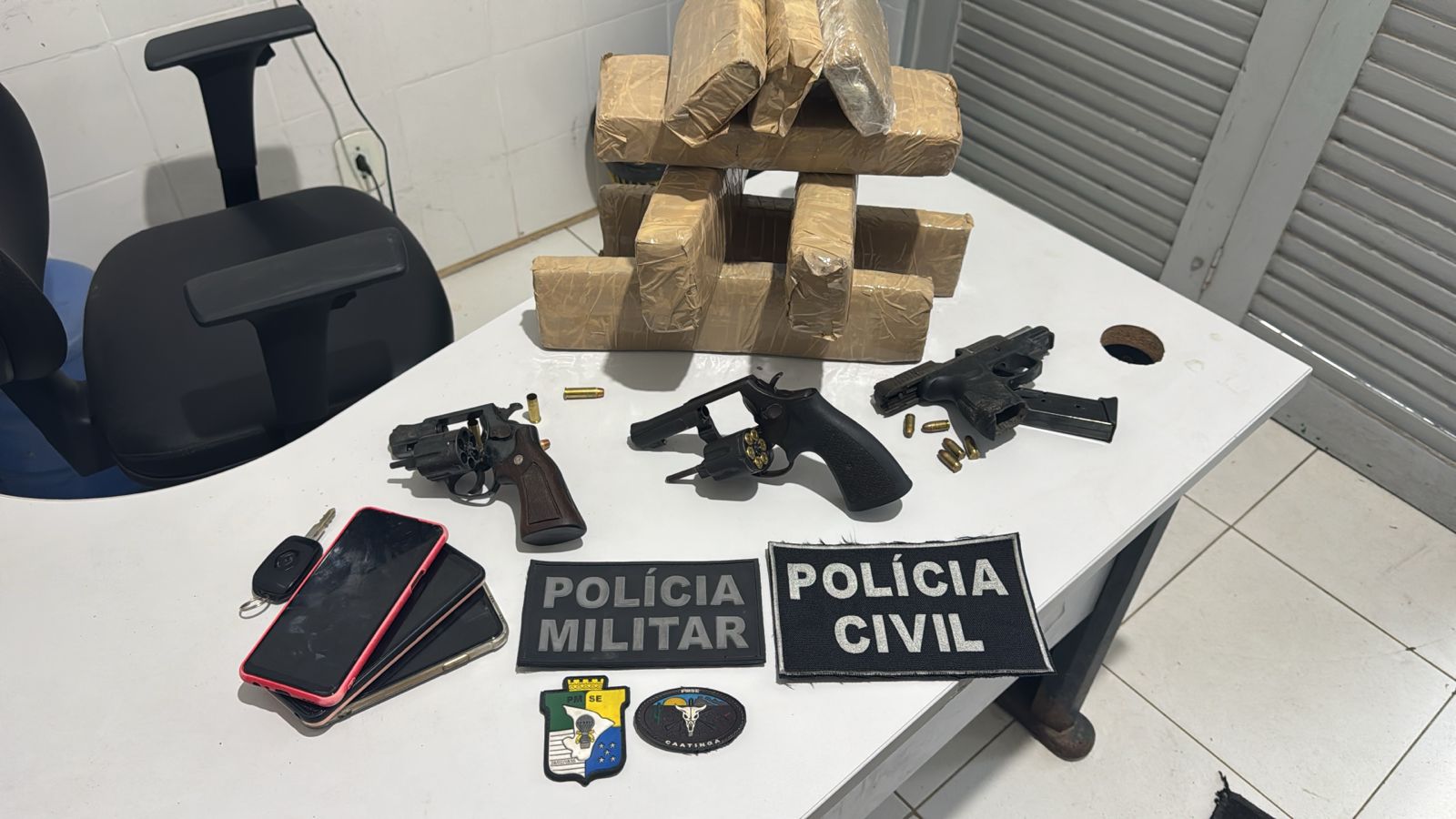 Com o trio, os policiais apreenderam três armas de fogo, oito tabletes de maconha, totalizando aproximadamente 6,3 kg e três celulares.