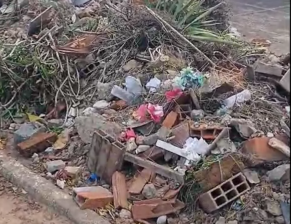 O vídeo, gravado por um morador, mostra montes de resíduos espalhados na área e critica a situação, afirmando que o problema é recorrente e que, mesmo após reclamações, o caso não tem sido resolvido de forma definitiva.