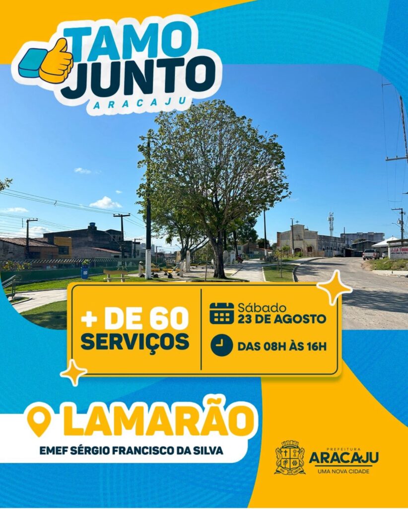 A comunidade do bairro Lamarão será contemplada neste sábado, 23 de agosto, com a 1ª edição do programa Tamo Junto Aracaju, iniciativa da Prefeitura de Aracaju que levará mais de 60 serviços gratuitos à população. O evento será realizado na Escola Municipal de Ensino Fundamental (EMEF) Sérgio Francisco da Silva, das 8h às 16h.