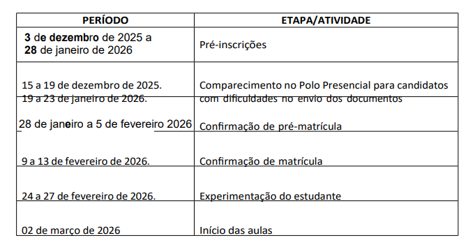 O cronograma a seguir apresenta datas e períodos prováveis para a realização do processo seletivo de estudantes para o curso EJA Ensino Médio Integrada à Qualificação Profissional de Produtor Cultural | EJA Ensino Médio Integrada à Qualificação Profissional de Assistente de Marketing e Vendas, podendo sofrer alterações conforme a necessidade.
