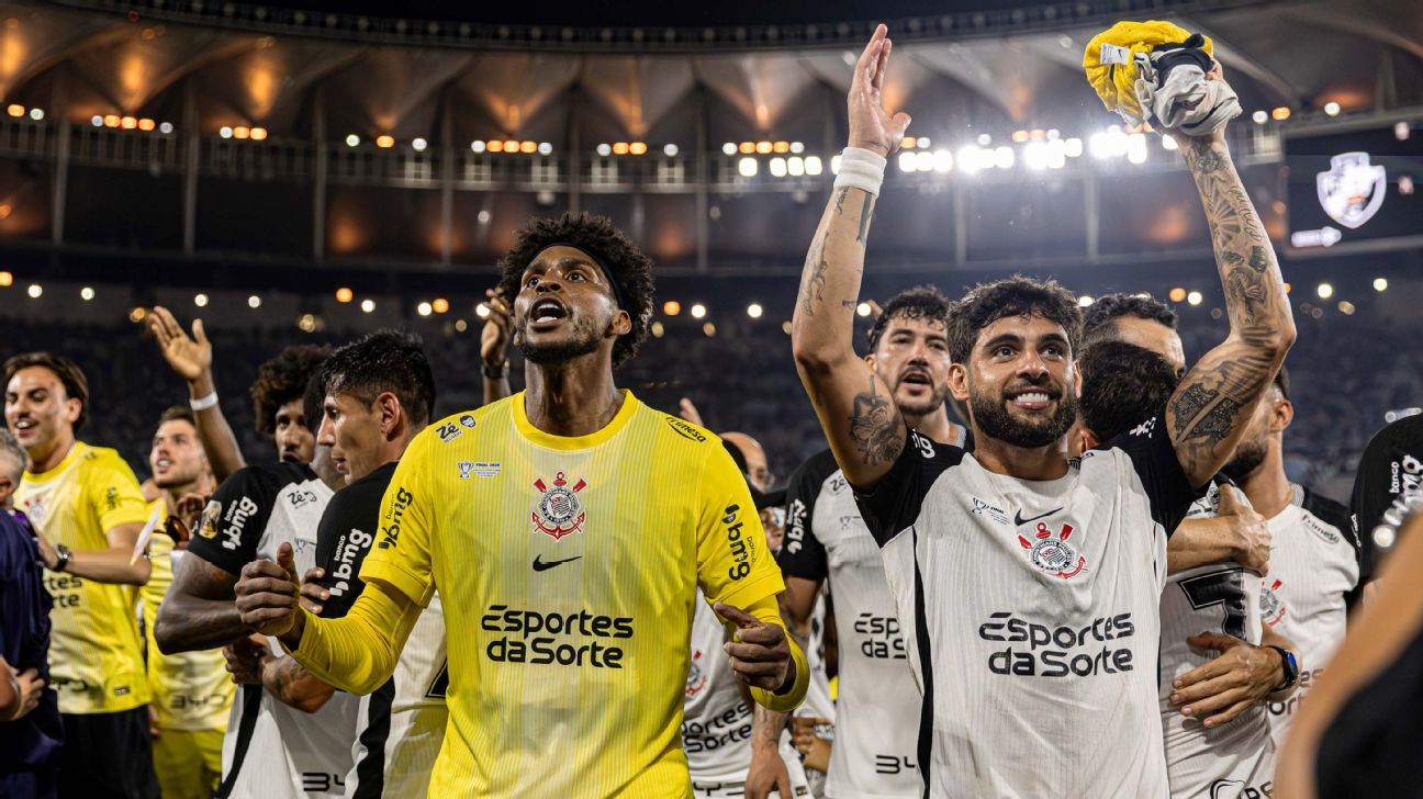 O goleiro Hugo Souza, do Corinthians, se emocionou ao ser presenteado pela noiva Rauany Barcellos logo após o título da Copa do Brasil, ainda no gramado, na noite de domingo (21).