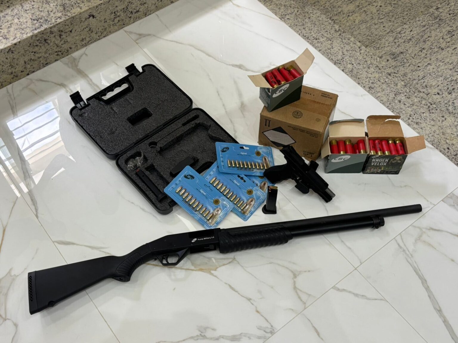 Durante as buscas, a polícia apreendeu duas armas sem registro: uma espingarda calibre 12 e uma pistola calibre .380.