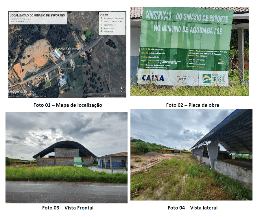 Outro ponto do relatório diz respeito à paralisação das obras de um ginásio de esportes, objeto do Convênio nº 844019/2017. Conforme dados do antigo Sistema de Gestão de Convênios e Contratos de Repasse (Siconv), o ajuste previa investimento de R$ 604.147,05 para a construção de um equipamento com área de 1.064 m², celebrado entre o Ministério do Esporte e o município, com intermediação da Caixa Econômica Federal.