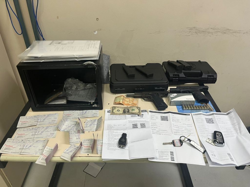 Durante as diligências, os agentes apreenderam duas armas de fogo, munições, documentos, dispositivos eletrônicos, cheques e moedas estrangeiras. Também foram recolhidas chaves de veículos e documentos de automóveis que podem auxiliar na continuidade das investigações.