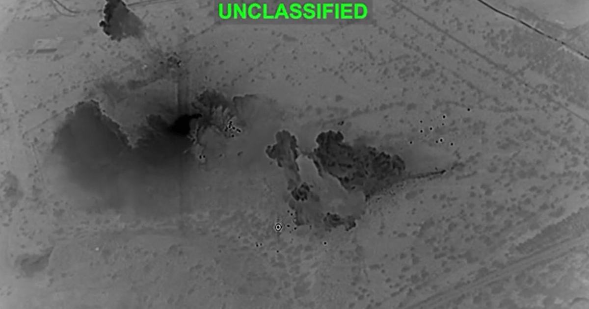 As imagens mostram impactos em instalações aeroportuárias e em uma pista de decolagem. Grandes explosões e fumaça preta também podem ser vistas ao longo do vídeo.