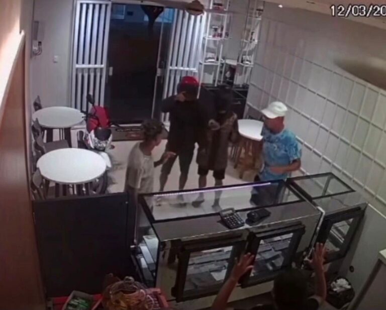 De acordo com as imagens, os suspeitos chegaram ao local em uma motocicleta e usavam capacetes, o que dificultou a identificação. Assim que entraram no estabelecimento, os homens sacaram armas de fogo e anunciaram o assalto, rendendo clientes e uma funcionária. A abordagem durou poucos segundos e pertences pessoais foram roubados.