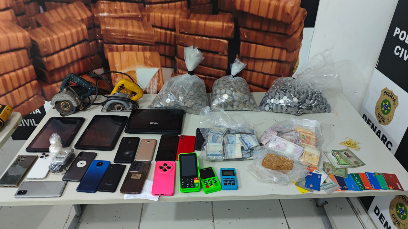 Durante as buscas, foram encontradas drogas uma grande quantidade de dinheiro trocado, além de materiais eletrônicos e outros objetos característicos da troca entre usuário e traficante