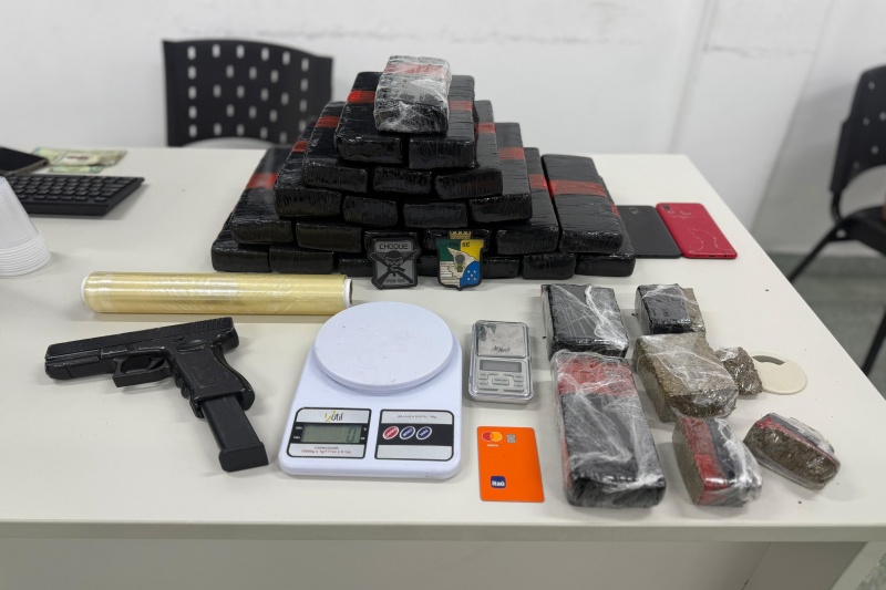 Durante a abordagem, nada foi encontrado com os dois. No entanto, durante as buscas, foram apreendidos diversos tabletes de maconha prensada, duas balanças de precisão, um rolo de papel filme, um simulacro de pistola e cinco aparelhos celulares. Segundo a mulher, o material pertenceria ao seu companheiro.