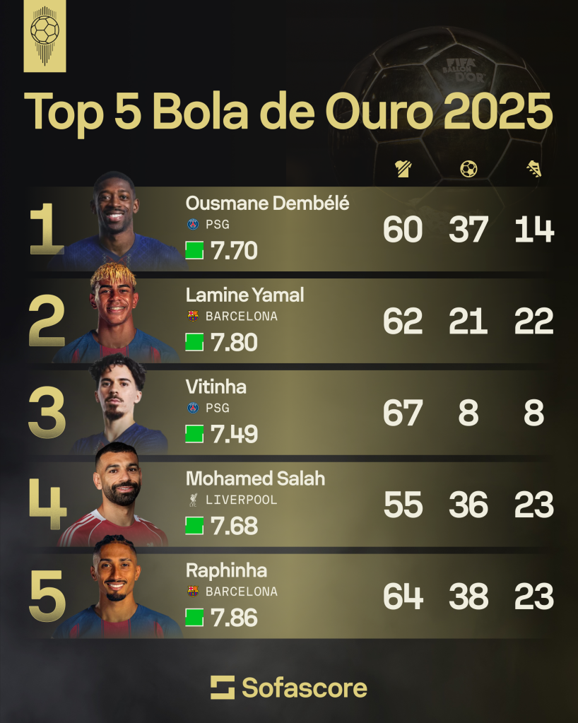 Levando em consideração a nota Sofascore, que analisa diversos fatores como passes, desarmes, remates e oportunidades de gol, Raphinha fica na primeira posição entre o top 5 da Bola de Ouro.