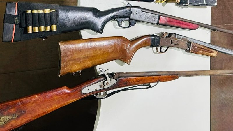 Ao chegarem no endereço informado, os policiais encontraram um automóvel e dois funcionários na área externa da propriedade. Com autorização dos homens, foi realizada uma busca no interior da residência, onde foi encontrada uma arma de fogo no chão de um dos cômodos. Além disso, foram apreendidas duas espingardas e um simulacro de arma de fogo, além de estojos deflagrados.